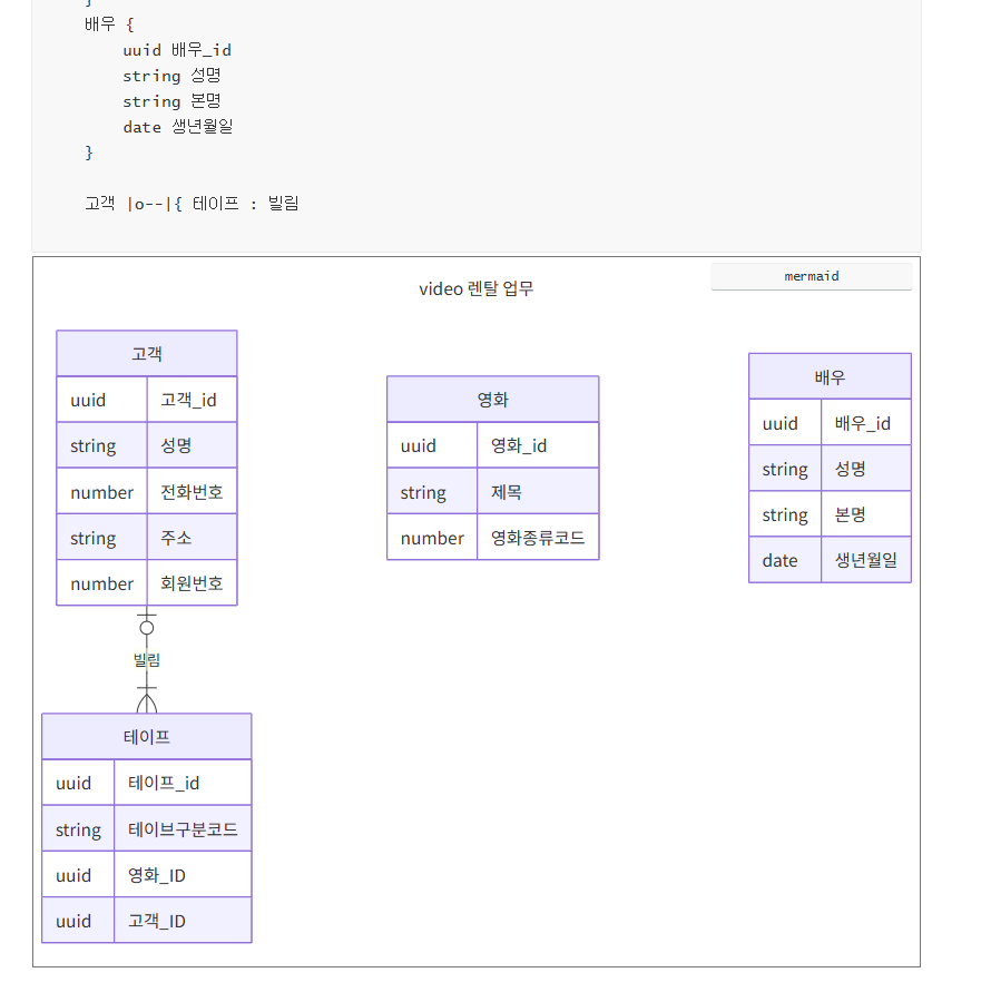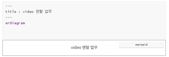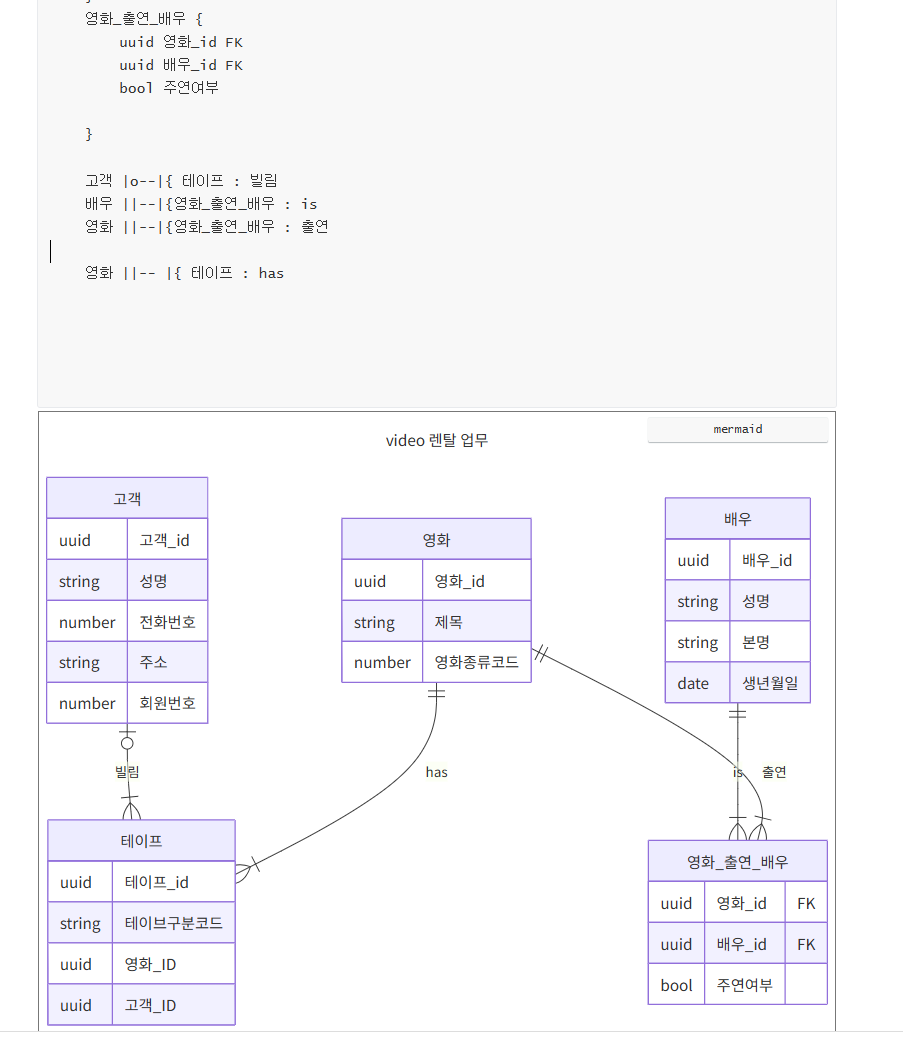 아직 개발중인것으로 보인다. 그렇지만 가장 대중적으로 많이 모델링하기 좋은 비디오 렌탈 업무실습을 만든다고 가정할때 어떻게 mermaid 로 만들어가는지 단계별로 해보자, 대부분 기본 데이터 모델링은 안다고 가정한다.
